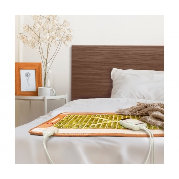 В коврик вшито 242 камня – натурального цельного нефрита. Они закреплены на термостойком арпатеке – искусственном материале, устойчивому к износу и механическим повреждениям. Управление нагревом пользователь осуществляет с помощью пульта, для изготовления которого производитель выбрал прочный и безопасный пластик.